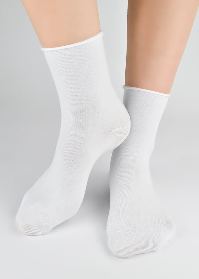 Damskie skarpety gładkie, wykonane z wysokiej jakości materiałów. Płaskie szwy i brak ściągacza zapewniają komfort i wygodę jednocześnie nie zsuwając się z nogi. Skład: 77% bawełna, 20% poliamid, 3% elastan.
