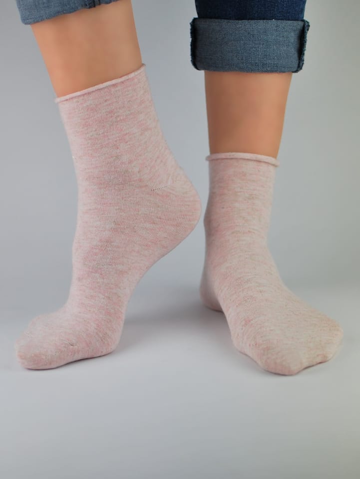 Skarpetki damskie wykonane z wysokiej jakości materiałów. Nieuciskający ściągacz, ozdobione połyskującą nitką. Skład: 79% bawełna, 16% poliamid, 4% włókno metalizowane, 1% elastan.