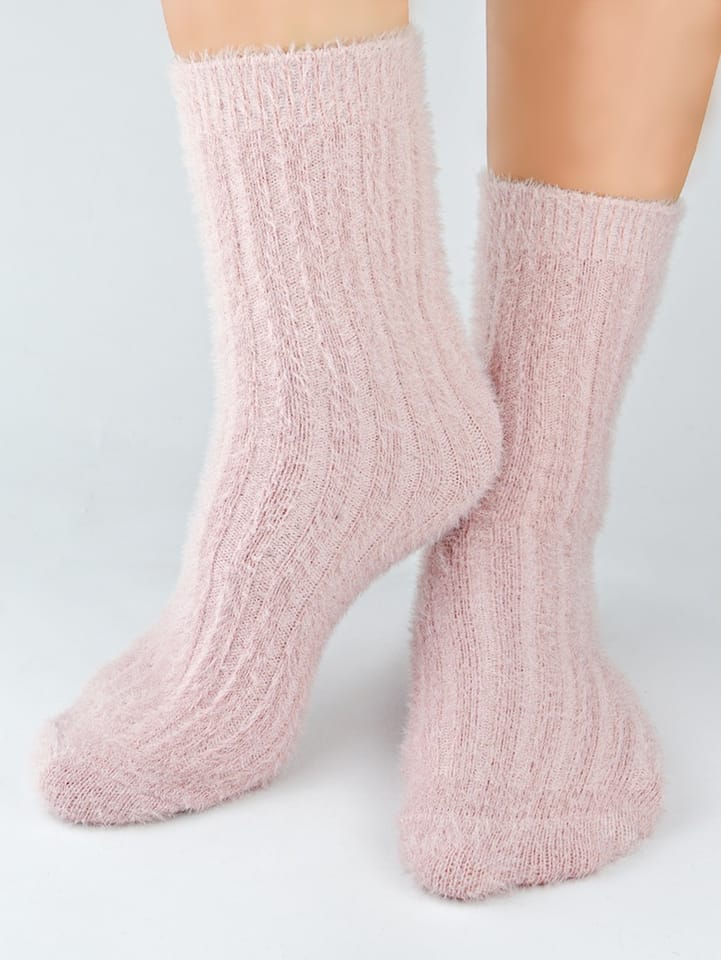 Damskie skarpetki wykonane z miękkiej dzianiny połączonej z puchatą nitką. Ciepłe i komfortowe, posiadają nieuciskający ściągacz. Skład: 86% poliamid, 12% poliester, 2% elastan.