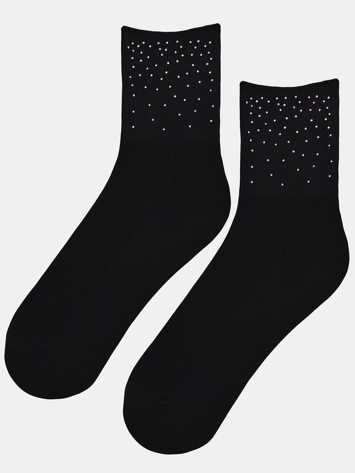 Wygodne, jednolite kolorystycznie skarpetki damskie z miękkiej i przyjemnej dla skóry bawełnianej dzianiny. Dzianina w drobny prążek. Nogawka ozdobiona koralikami. Skład: 45% wiskoza, 24% akryl, 17% poliamid, 12% wełna, 2% elastan.