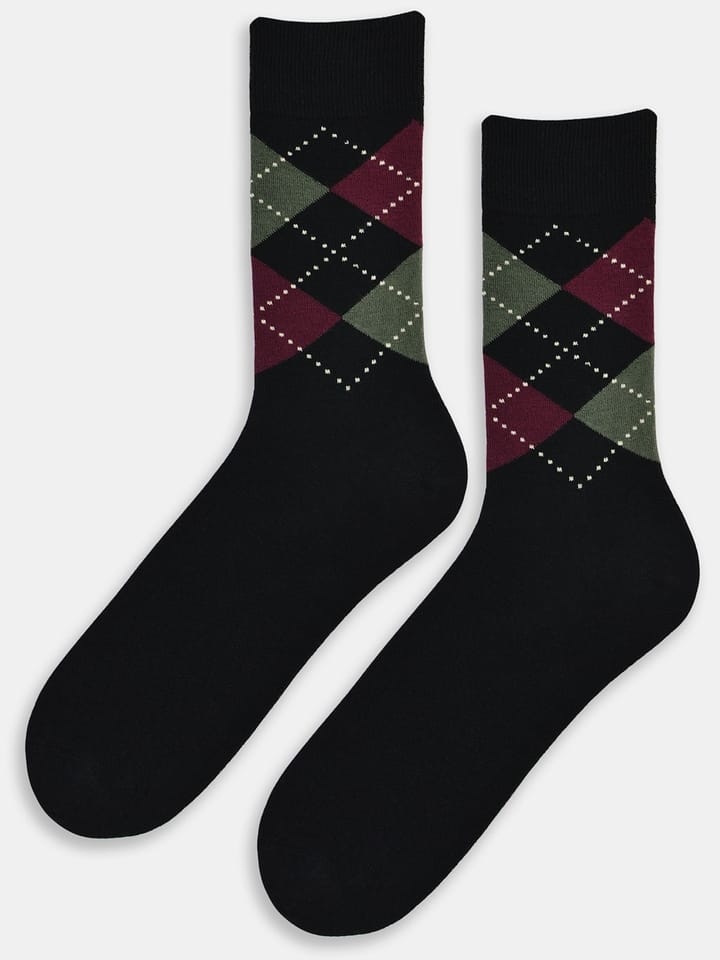 Eleganckie, bawełniane skarpetki do garnituru ze wzorem w modną kratę. Płaski szew, nieuciskający ściągacz. Skład: 76% bawełna, 21% poliamid, 3% elastan.