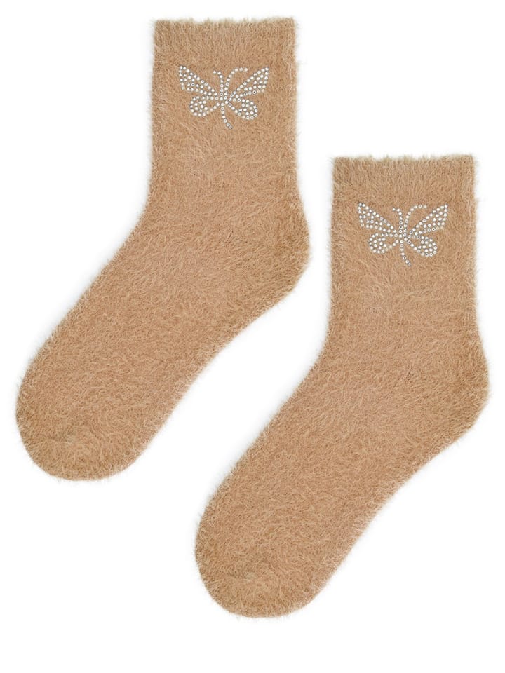Skarpety damskie z miękkiej dzianiny z miłym włoskiem. Wygodny, nieuciskający ściągacz. Ozdobione aplikacją z cekinowym motylem na kostce. Skład: 95% poliamid, 5% elastan.