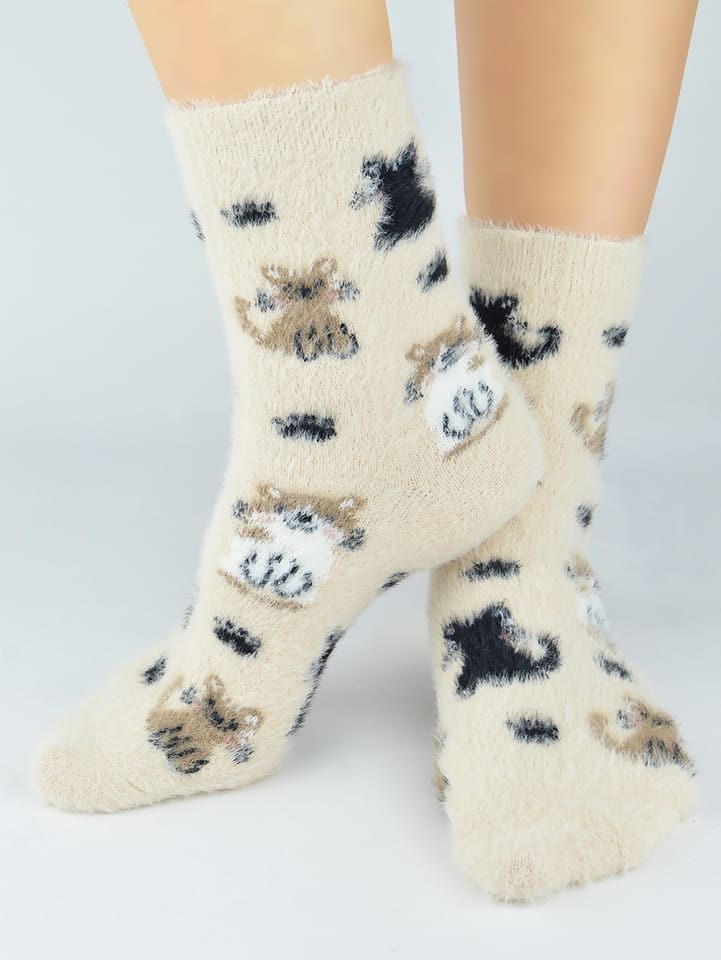 Skarpety damskie z miękkiej dzianiny z miłym włoskiem. Wygodny, nieuciskający ściągacz. Ozdobione kolorowym wzorem w koty. Skład: 95% poliamid, 5% elastan.
