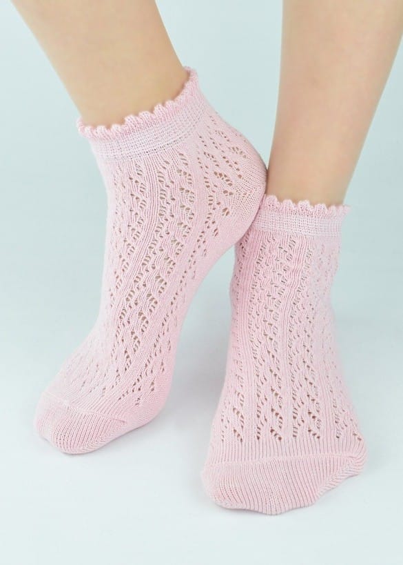 Bawełniane skarpetki dziecięce z miękkiej dzianiny. Efektowny, ażurowy wzór i płaskie szwy. Nieuciskający, ozdobny ściągacz. Skład: 75% bawełna, 22% poliamid.