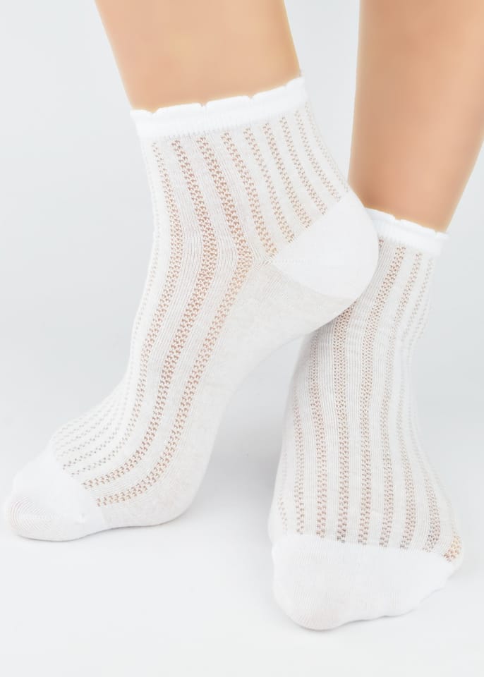 Wykonane z wysokiej jakości bawełny skarpetki oferują miękkość i komfort przez cały dzień, a subtelny ażurowy wzór nadaje im unikalnego charakteru. Nieuciskający ściągacz, płaskie szwy. Skład: 78% bawełna, 22% poliamid, 2% elastan.