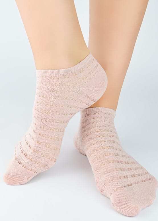 Żakardowe skarpety damskie bardzo miłe w dotyku z dzianiny zapobiegającej poceniu się, w ciekawy wzór. Nieuciskający ściągacz, płaskie szwy, idealnie dopasowują się do stopy. Skład: 75% bawełna, 22% poliamid, 2% elastan.