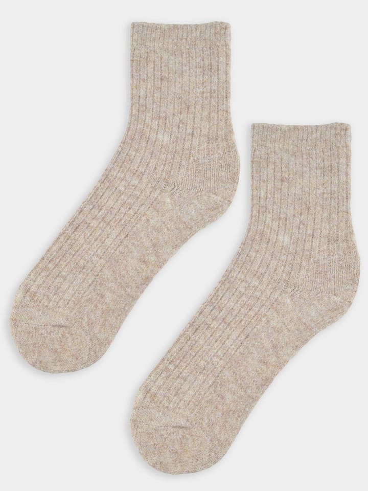 Skarpety damskie z domieszką wełny. Zdobione w lekki prążek. Przyjemne w dotyku z wygodnym nieuciskającym ściągaczem.Skład: 45% akryl, 39% poliester, 13% wełna, 3% elastan.