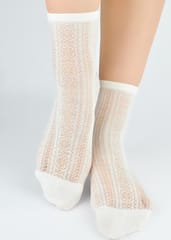 Skarpetki damskie wykonane z przyjemnej naturalnej wiskozowej dzianiny z dodatkiem jedwabiu ozdobione pięknym ażurowym wzorem. Idealnie dopasowują się do stopy, posiadają wygodny ściągacz. Skład: 69% wiskoza, 19% poliamid, 9% jedwab, 3% elastan.