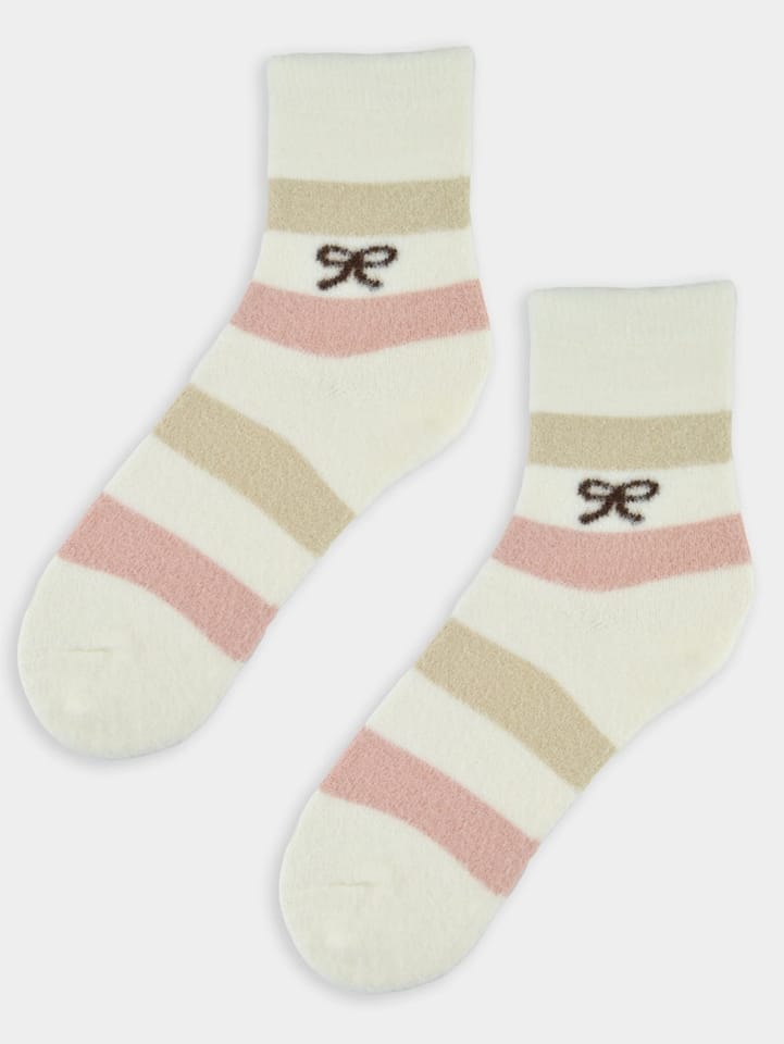 Skarpety damskie wykonane z miękkiej, puchatej dzianiny wzorowanej w pasy z kokardą. Wygodny, nieuciskający ściągacz.