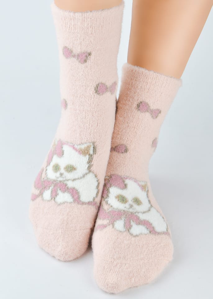 Skarpety damskie wykonane z miękkiej, puchatej dzianiny z wzorem kota. Wygodny, nieuciskający ściągacz. Skład: 95% poliamid, 5% elastan.
