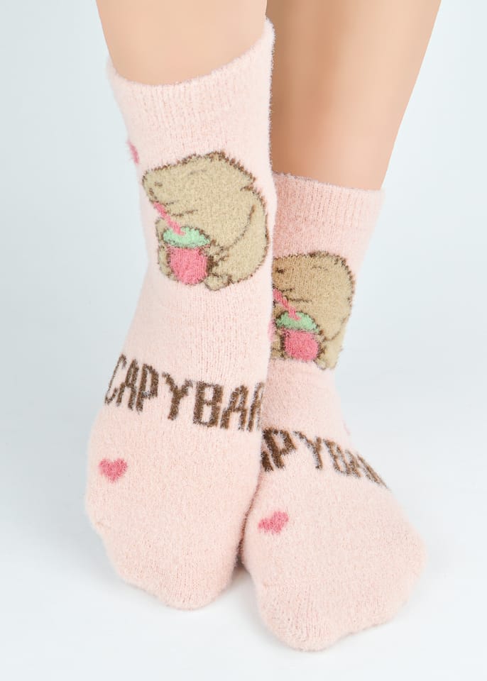 Skarpety damskie wykonane z miękkiej, puchatej dzianiny z wzorem Capybary. Wygodny, nieuciskający ściągacz. Skład: 95% poliamid, 5% elastan.