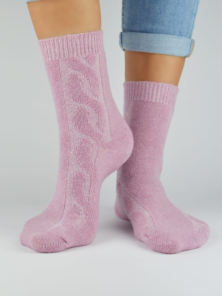 Skarpety damskie z miękkiej dzianiny z dodatkiem wełny.Wzór w efektowny warkoczowy.Szeroki, nieuciskający ściągacz.Skład: 42% wełna, 20% poliamid, 19% wiskoza, 18% poliester, 1% elastan.