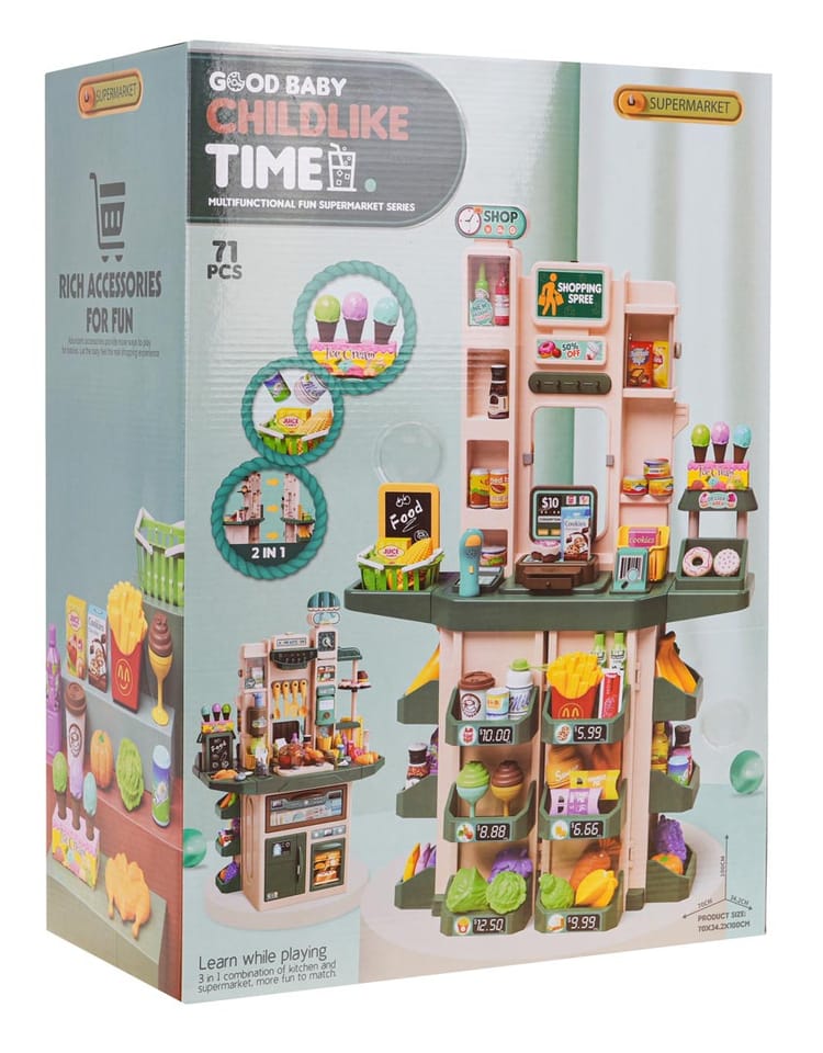 | Wymiary | - lada sklepowa ok. 100 cm x 70 cm x 34,2 cm,- skaner ok. 10 cm x 4 cm x 3 cm,- kasa sklepowa ok. 14 cm x 13,5 cm x 11,5 cm,- kalkulator ok. 8,5 cm x 7 cm,- czytnik kodów ok. 7,5 cm x 5,5 cm,- tablica do malowania ok. 14,5 cm x 10,3 cm x 1 cm,- opakowanie kredy ok. 8 cm x 3 cm x 1 cm,- gąbka ok. 5 cm x 5 cm x 2 cm,- koszyczek zakupowy ok. 10,5 cm x 7,5 cm x 5,5 cm,- sałata ok. 5,5 cm x 3,5 cm,- kapusta ok. 6 cm x 4 cm,- marchew ok. 10 cm x 4 cm,- kukurydza ok. 9,5 cm x 4 cm,- winogrona ok. 8,5 cm x 4 cm,- karambola ok. 8,5 cm x 5 cm,- limonka ok. 7,5 cm x 4,5 cm,- ananas ok. 8 cm x 4,5 cm,- lody w pucharku ok. 8,5 cm x 5,5 cm, lody w rożku ok. 8,5 cm x 3,5 cm,- frytki ok. 10 cm x 9 cm x 4 cm,- rogalik ok.9,5 cm x 3 cm,- kartonik z makaronem, ciasteczkami, cukierkami, czekoladą ok. 8 cm x 6 cm x 3,3 cm,- cukierki ok. 4,5 cm x 2 cm,- monety ok. 2 cm i 2,5 cm średnicy,- opakowanie ok. 55,5 cm x 41 cm x 22 cm. |