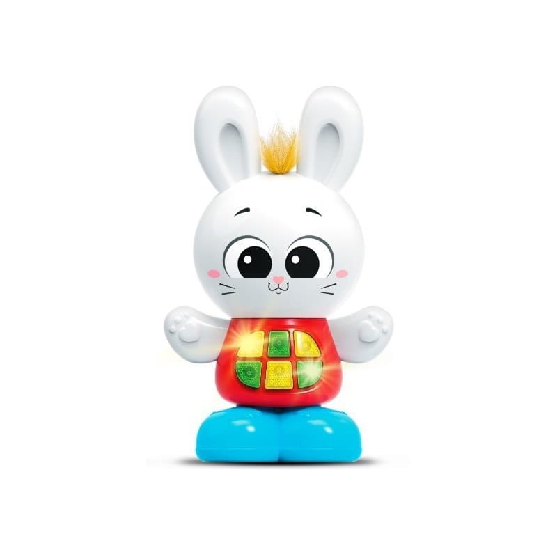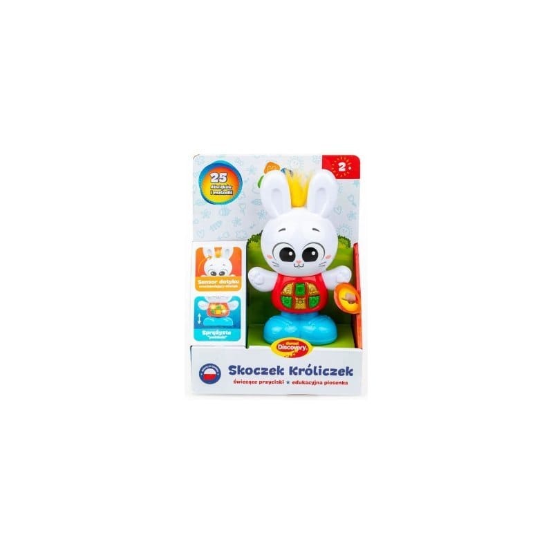 Skoczek Króliczek Wesoły, rozgadany króliczek wie jak zainteresować najmłodszych! Zna aż 25 różnych dźwięków i melodii, w tym nawet edukacyjną piosenkę. Poszczególne funkcje aktywują świecące przyciski, znajdujące się na króliczym brzuchu. Głowę zwierzaka zdobi żółta czuprynka z sensorem dotyku. Gdy dotkniemy jej, aktywujemy zabawne dźwięki. Króliczek posiada sprężyste nóżki, co umożliwia przyciśnięcie go, której to czynności towarzyszy odgłos sprężynowych podskoków. Cechy produktu: - 25 dźwięków i melodii; - świecące przyciski; - edukacyjna piosenka; - wesołe melodie; - włochata czuprynka - sensor dotyku; - ruch sprężynowy; - regulacja głośności; Baterie: 3 x LR14 (zawarte w zestawie) Wiek: 2+
