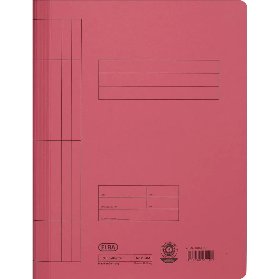 Skoroszyt w formacie A4, wykonany z czerwonego kartonu Manilla barwionego w masie. Na frontowej okladce znajduje sie pole do opisu zawartości. Specjalne bigowanie na grzbiecie umozliwia jego poszerzenie dla zwiekszenia pojemności. Metalowe wąsy dobrze mocują dokumenty, co zapobiega ich wypadaniu.