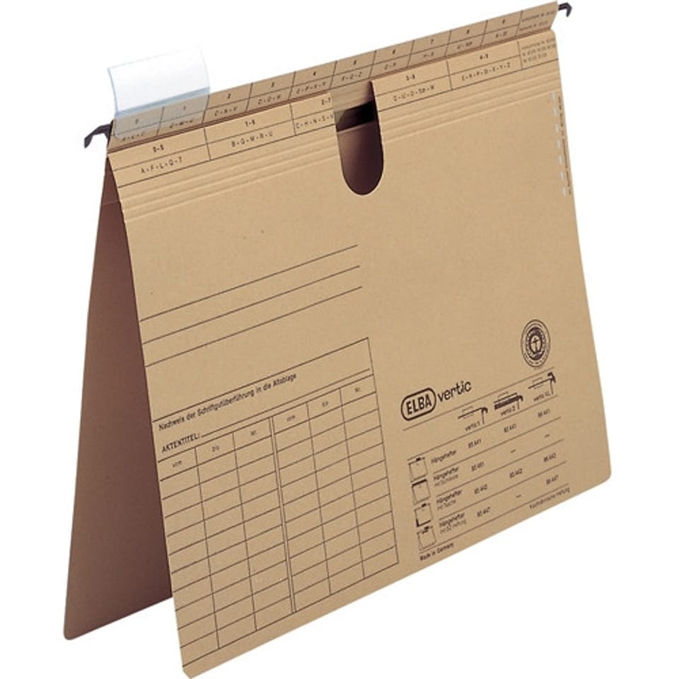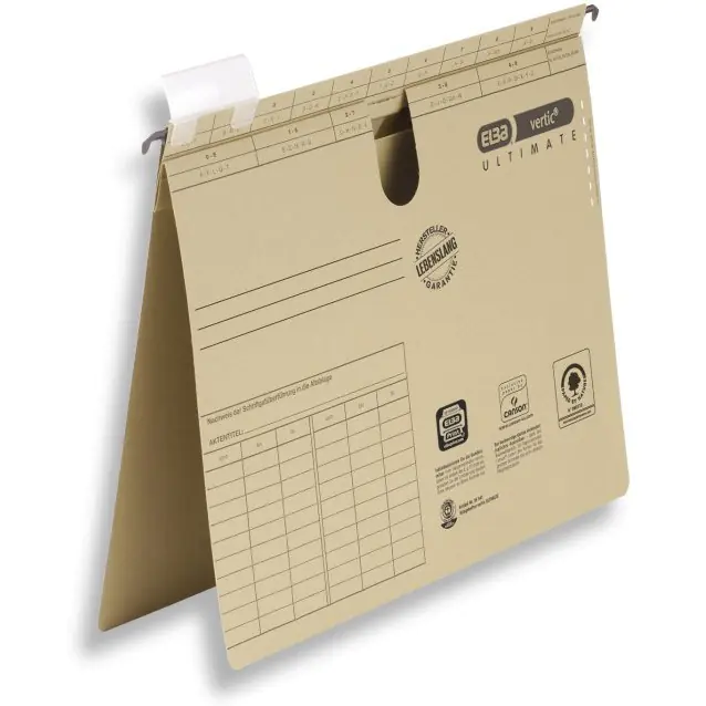 Skoroszyt zawieszkowy wykonany z mocnego kartonu w bezowym kolorze. W zestawie przesuwny szyldzik z wymienną etykietą opisową.