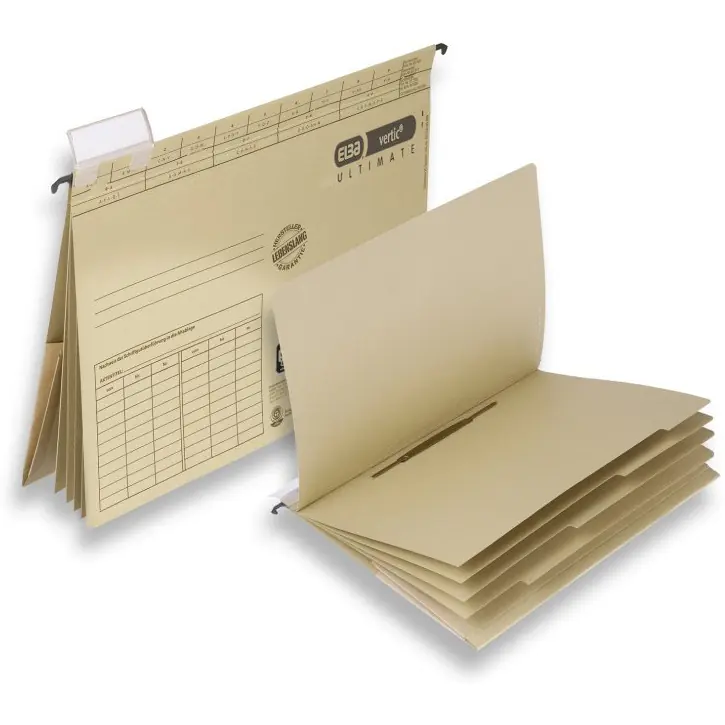 Skoroszyt zawieszkowy wykonany z mocnego kartonu w bezowym kolorze. W zestawie przesuwny szyldzik z wymiennymi etykietami opisowymi.