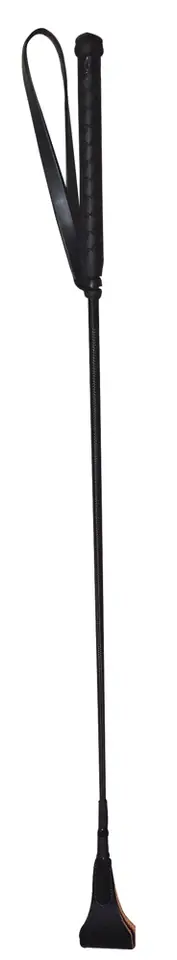 Black leather crop with doubled leather loop at the tip and leather loop at handle for a secure grip. Lengths: 65 cm.