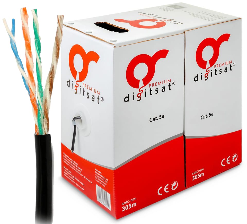 Skrętka komputerowa UTP kategorii 5e DIGITSAT do zastosowań zewnętrznych, żyła miedziana (drut) 0,49 mm izolowana skręcona w pary, powłoka kabla polietylen PE w kolorze czarnym, oznaczenie metrowe.