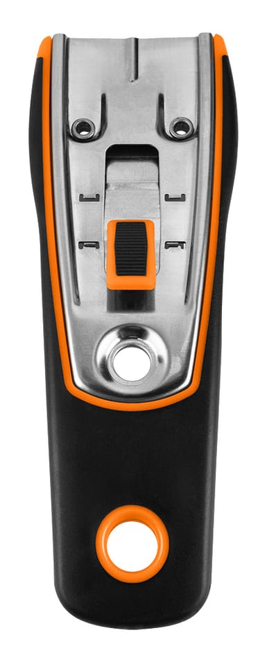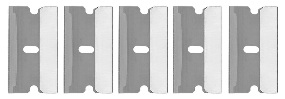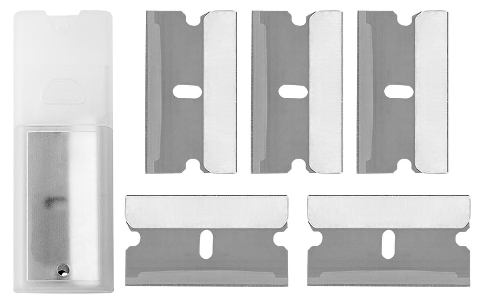 Skrobak w zestawie 5 ostrzy, materiał korpusu aluminium i guma TPR, materiał ostrzy stal nierdzewna, łatwy system wymiany ostrzy