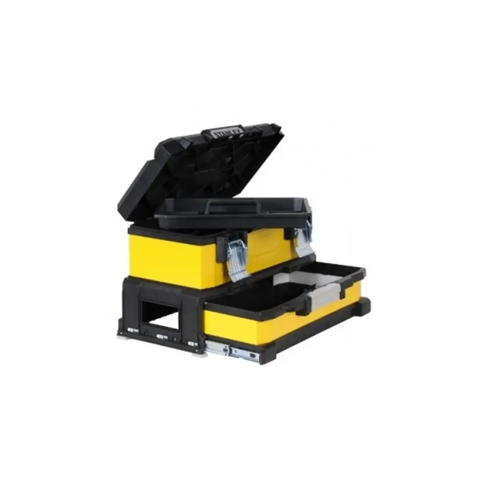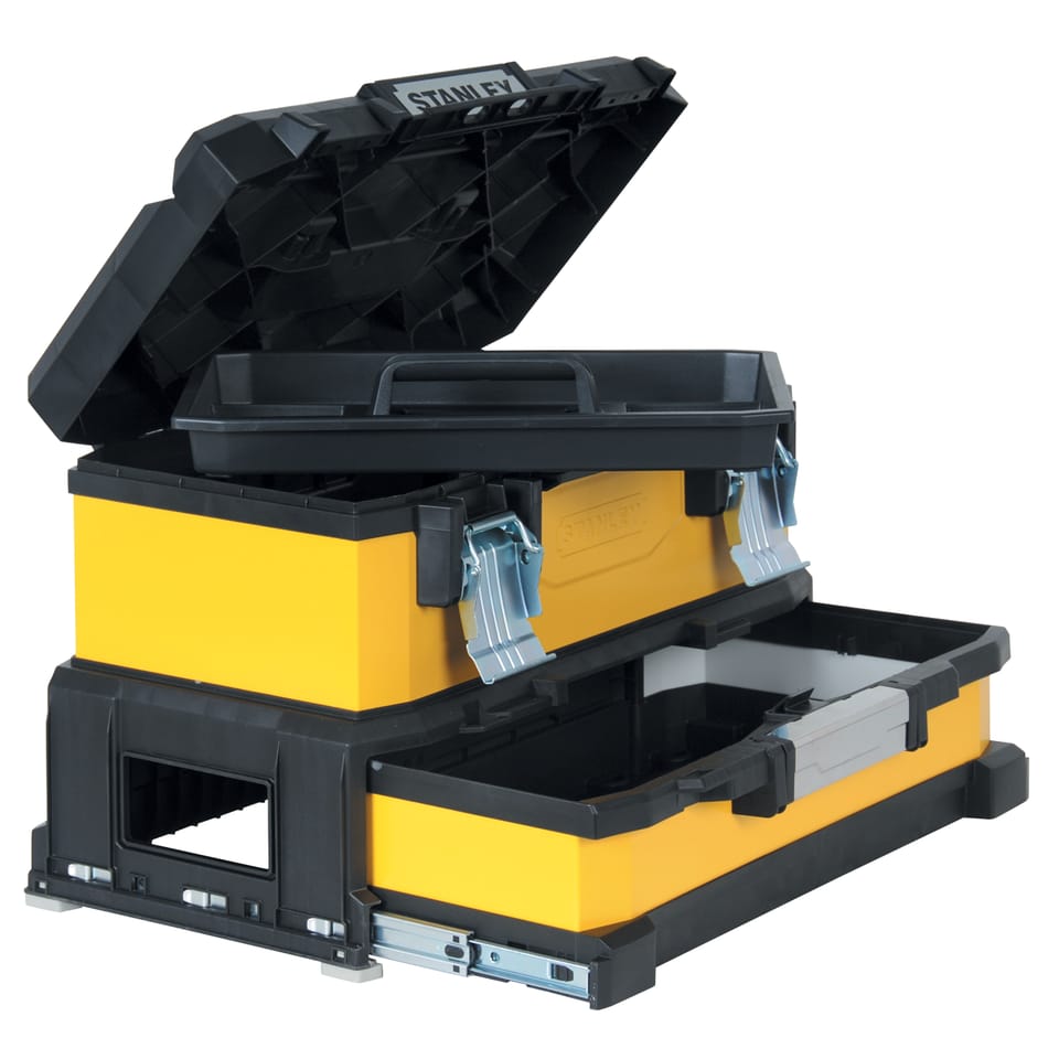 Skrzynia z wysuwaną z szufladą StanleyWygodny szeroki uchwytSzuflada o wysokości 10cm, zamocowana na prowadnicach kulkowychDuże, wygodne klamry zamykająceWymiar 54,5 x 28 x 33,5 mm