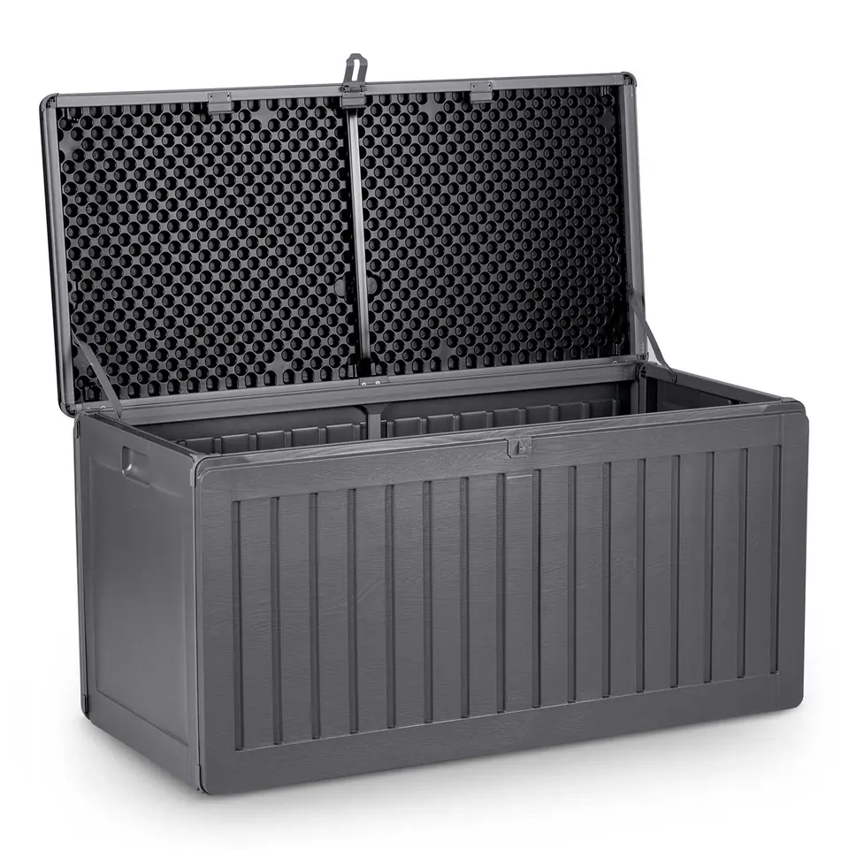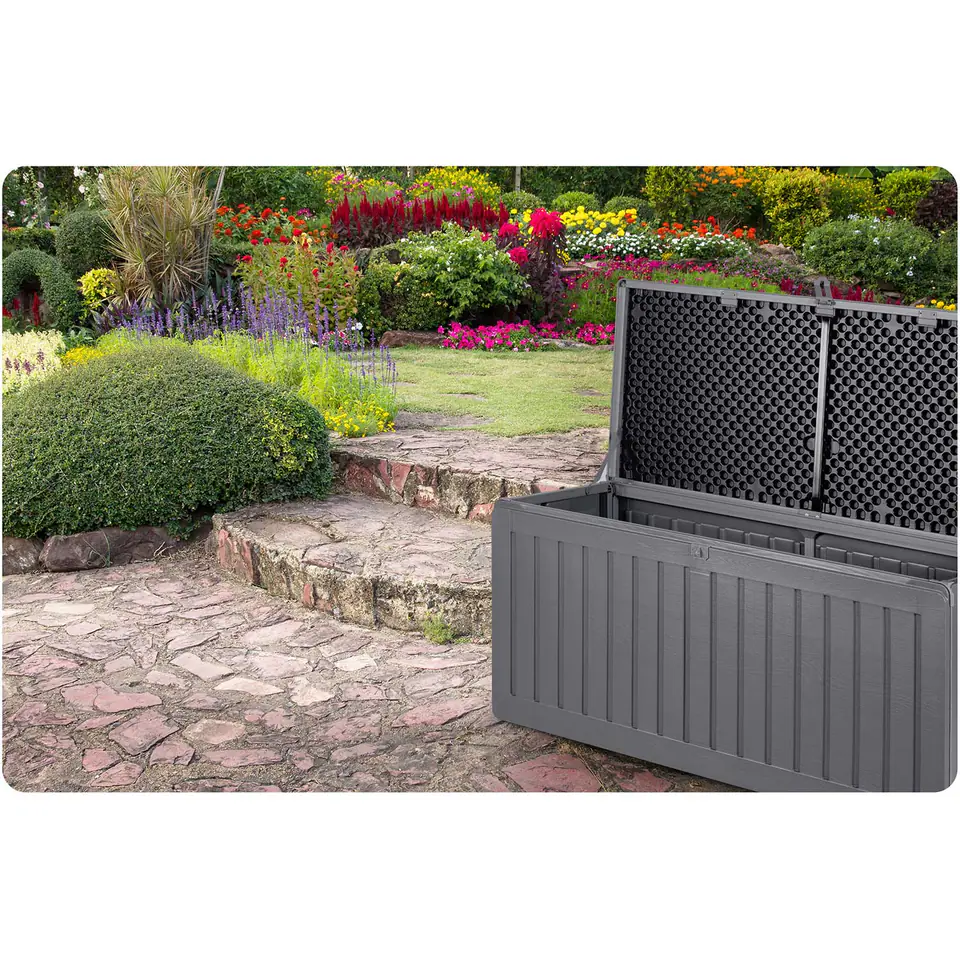 Pojemna skrzynia ogrodowa ułatwia przechowywanie w ogrodzie, na balkonie oraz wokół domu niezbędnych rzeczy, które użytkujemy na co dzień (poduszki, materace, pokrowce, zabawki, narzędzia) oraz wiele innych rzeczy.