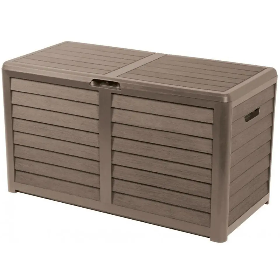 Na bokach skrzyni umieszczone wygodne uchwyty, które ułatwiają przenoszenie. Modny wzór imitujący naturalne drewno oraz piękny kolor sprawi, że będzie pasowała do każdego ogrodu i ładnie prezentowała się pośród zieleni.