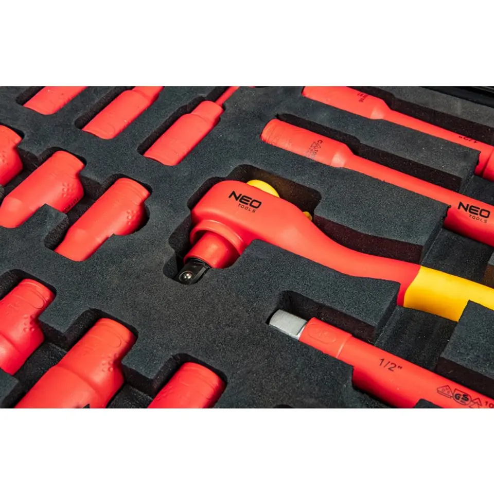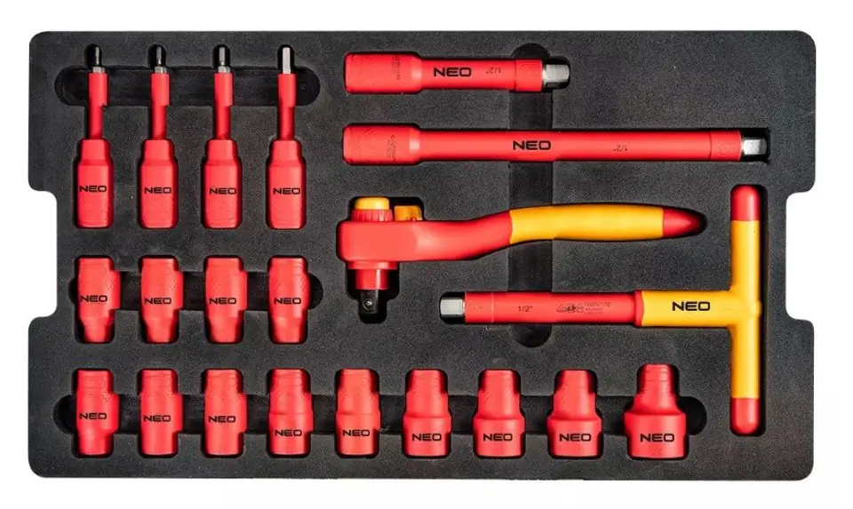 Skrzynia serwisowa elektryka (01-311) materiał skrzyni polipropylen, trzy uchwyty w tym jeden teleskopowy z blokadą, koła, zawór ciśnieniowy, gumowa uszczelka, mocne zatrzaski, wkłady piankowe z miejscem na dłoń, narzędzia 1000 V: Szczypce uniwersalne 180 mm, szczypce wydłużone proste 200 mm, szczypce boczne 160 mm, szczypce do rur 250 mm, obcinak do kabli 160 mm, ściągacz izolacji 160 mm, wkrętaki PH0x60, PH1x80, PH2x100, PH3x150 mm, SL 2,5x75 mm, 3x100 mm, 4x100 mm, 5.5x125 mm, 6.5x150 mm, próbnik elektryczny 250 V, nóż 190 mm, klucze płaskie 8, 10, 11, 12, 13, 14, 15, 16, 17, 18, 19, 22, 24 mm, klucz nastawny 210 mm, klucze nasadowe 10, 11, 12, 13, 14, 16, 17, 18, 19, 21, 22, 24, 27 mm, przedłużki 125 i 250 mm, pokrętło T 190 mm, grzechotka 230 mm (36 zębów), nasadki hex 4, 5, 6, 8 mm.