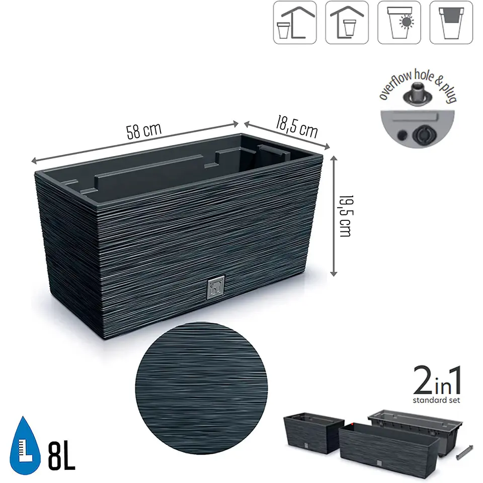Specyfikacja- Marka: Prosperplast- Linia: Furu Case- Symbol: DFC400-S433- Kategoria: doniczka / skrzynka z wkładem- Kształt: prostokątny- Materiał: tworzywo sztuczne- Zastosowanie: wewnątrz i na zewnątrz- Odporna na promieniowanie UV- Wyposażona w otwór przelewowy i korek- Długość: 39,5 cm- Szerokość: 18,5 cm- Wysokość: 19,5 cm- Objętość wkładu / skrzynki: 8 / 12 l- Kolor: antracytowy