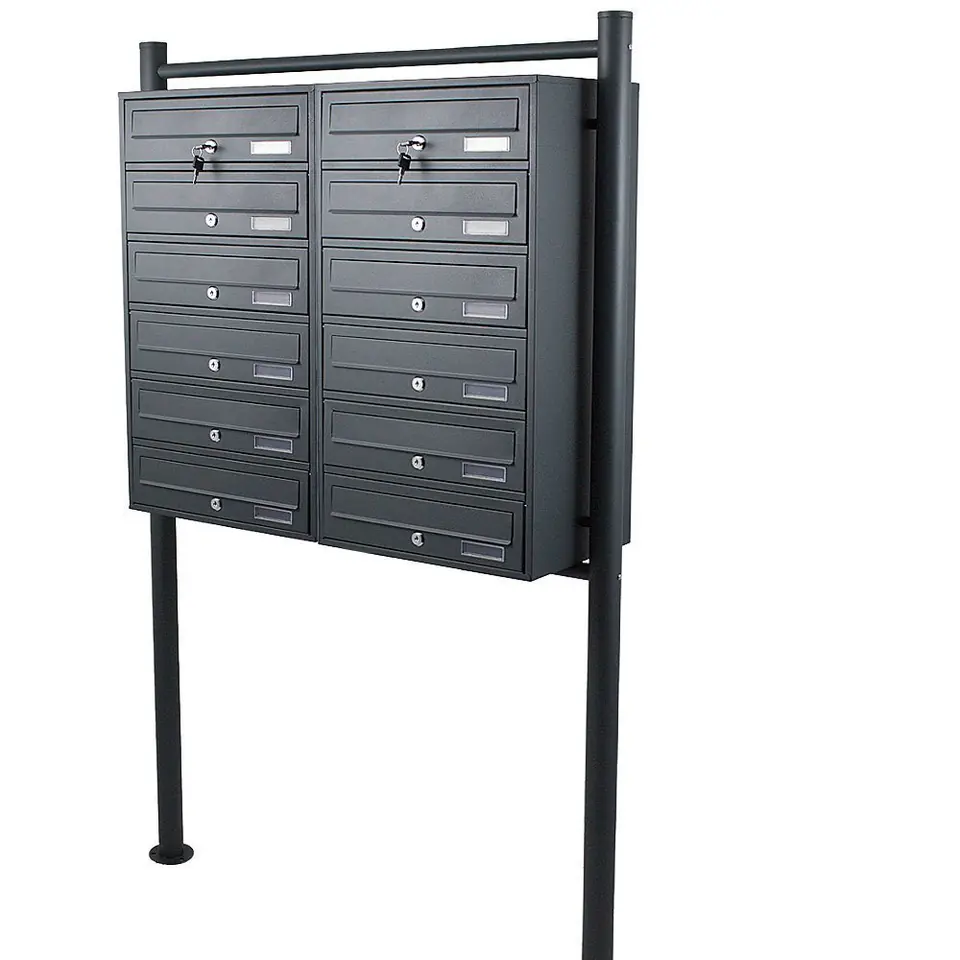Dzięki ponadczasowej, eleganckiej konstrukcji oraz wykonaniu ze stali nierdzewnej system Euro skrzynek na listy doskonale sprawdza się w firmach oraz na osiedlach mieszkaniowych. Ze względu na zwartą konstrukcję, system letterbox 12 skrzynek zajmuje niewiele miejsca. Montaż jest w ten sposób łatwy i szybki. Zakres dostawy obejmuje materiały montażowe do betonowych fundamentów.
