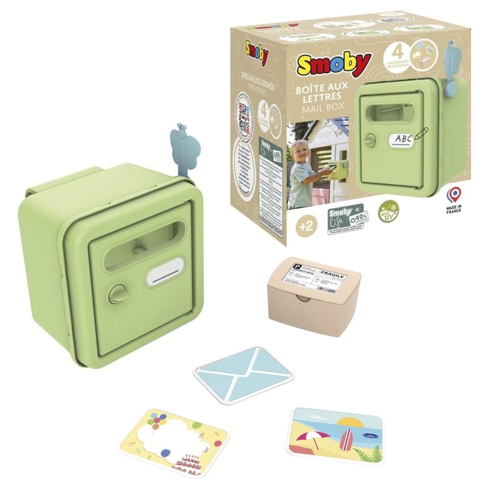 Smoby Life Skrzynka na listy\nSkrzynka pocztowa, którą można zawiesić na ścianie, drzwiach lub oknie każdego domku Smoby. W zestawie ze skrzynką, kartki, koperta oraz paczka. Część plastiku wykorzystanego do produkcji pochodzi z recyklingu. Wyprodukowane we Francji. Wymiary: 20,7x17,6x15,4 cm, 2l+