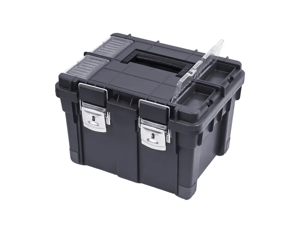 Cztery organizery w pokrywie, poliwęglanowe pokrywy organizerów, rączka HD, metalowe zapięcia, głęboka tacka, antypoślizgowe nóżki, doskonała logistyka.