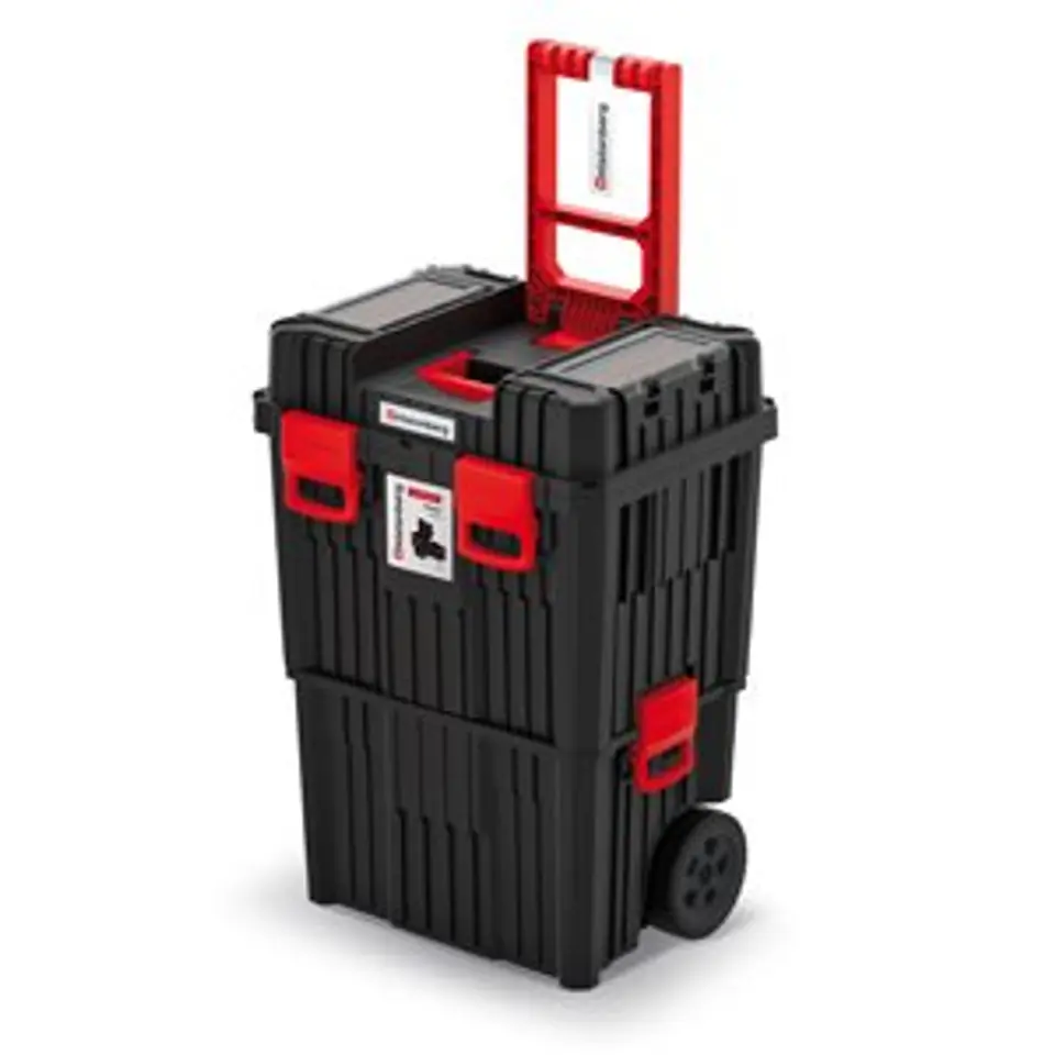 3 w 1: skrzynia, kosz i nosidło.Dwa uchwyty: do transportowania i przenoszenia.2 organizery w pokrywie: 2 kubeczki, 2 przegrody.Przezroczysta pokrywa organizera z wytrzymałego poliwęglanu.Korpus wykonany z mieszanki polimerów o podwyższonej wytrzymałości.Lita uszczelka zwiększająca ochronę przed czynnikami zewnętrznymi.Wytrzymałe zapięcia z ABS. Dwukomponentowe koła pokryte elastomerem.Ładowność 25 kg. Wymiary: 450 x 360 x 640 mm.