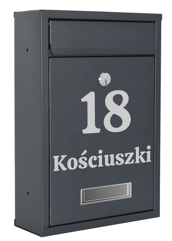 Skrzynka pocztowa na listy Gustav antracyt z napisamiPrzeznaczenie: ochrona korespondencji⭐Kolor: antracyt⭐Solidne wykonanie⭐Okienko na dane adresowe⭐Zamykana na klucz Praktyczna skrzynka pocztowa ze stali galwanizowanej malowanej proszkowo. Nowoczesny i ponadczasowy styl obok którego nie można przejść obojętnie. Skrzynka oprócz podstawowych funkcji, będzie cieszyć oko, a także wzbudzi zazdrość Twoich sąsiadów! Wykonana z wysokiej jakości materiałów odpornych na warunki atmosferyczne materiałów, dzięki czemu wszelka korespondencja jest bardzo dobrze zabezpieczona. Produkt spersonalizowanyMożliwość wykonania dowolnego napisu: nr domu, nazwa firmy, nazwisko, ulica itp. Napis wykonany jest metodą ploterową folią Oracal, odporną na warunki atmosferyczne. Folia jest w kolorze srebrnym Cechy produktuStal galwanizowanaOdporność na warunki atmosferyczneOkienka na dane adresoweMontaż wewnątrz i na zewnątrzZamykana na kluczOtwory wentylacyjne Wymiary produktuWysokość: 32 cmGłębokość: 8,5 cmSzerokość: 21,5 cmOkienko identyfikacyjne: 9 x 2,5 cmWrzutnia: 17,5 x 3 cmRozstaw śrub do montażu ściennego: 15,5 x 24 cm W zestawieSkrzynka2 kluczykiZestaw montażowy Po zakupie podaj nam wytyczne do personalizacji Twojej skrzynkiPo dokonanym zakupie w wiadomości do sprzedającego proszę podaj: wybrany wzór czcionki, napis do wykonania. (przykład: wzór2, Kościuszki 18). Napis zostanie wykonany dokładnie wg wytycznych z wiadomości do sprzedającego. Napisy mogą mieć same wielkie litery np. "KOŚCIUSZKI" lub małe litery np. "cicha". Wyjątkiem jest wzór4 którego czcionka ma tylko wielkie litery. Jeśli napis ma być wykonany ze skrótem ulicy "ul." to również prosimy podaj taką informację. Polskie znaki są dozwolone (np: ę,ą,ć,ś itp.).Dostępne wzory:wzór1wzór2wzór3wzór4wzór5 Marka:GockowiakKod produktu:5902340327548Kolor:antracytWysokość całkowita:32 cmSzerokość całkowita:21,5 cmGłębokość cakowita:8,5 cmMateriał:stal szlachetna galwanizowana Informacje dodatkoweProsimy o przemyślany zakup. Nie ma możliwości zwrotu produktów spersonalizowanych.Przedstawione kolory należy traktować poglądowo - mogą odbiegać od rzeczywistych ze względu na różne ustawienia monitorów oraz proces obróbki zdjęć. Rzeczywiste wymiary mogą się różnić od podanych wyżej. Tolerancja błędów może wynosić +/- 5%.
