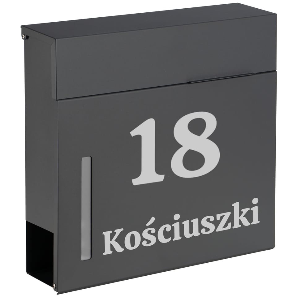 Skrzynka pocztowa na listy Jerez antracyt z napisamiKolor: Antracyt⭐️ W zestawie: skrzynka na listy z napisem + 2 kluczyki + zestaw montażowy⭐️ Stal nierdzewna galwanizowana⭐️ Wymiary: 34,5 x 36 x 9 cm⭐️ Posiada gazetnik oraz okienko podglądu zawartości⭐️ Wrzut zasłonięty uchylną klapą z cichym domykiem⭐️ Zamykana na klucz⭐️ Zestaw montażowy: dystanse, kołki, wkręty Skrzynka na listy Jerez z napisem to wyjątkowe połączenie stylu, trwałości i praktyczności. Wykonana ze stali galwanizowanej, nie tylko doskonale wygląda, ale także jest odporna na warunki atmosferyczne. Skrzynka posiada wygodne miejsce na gazety oraz ulotki, a wrzut na listy jest zasłonięty uchylną klapą z mechanizmem cichego domyku, co dodatkowo zabezpiecza korespondencję i eliminuje hałas przy zamykaniu. Dzięki zamknięciu na klucz Twoje listy i dokumenty będą zawsze bezpieczne. Dodatkowo, skrzynka posiada okienko do podglądu zawartości, co pozwala szybko sprawdzić, czy przyszła nowa korespondencja. Zestaw montażowy sprawia, że instalacja skrzynki jest szybka i bezproblemowa. Produkt spersonalizowanyMożliwość wykonania dowolnego napisu: nr domu, nazwa firmy, nazwisko, ulica itp. Napis wykonany jest metodą ploterową folią Oracal, odporną na warunki atmosferyczne. Folia jest w kolorze srebrnym. Cechy produktuMateriał: stal nierdzewna galwanizowana malowana proszkowoOzdobna wstawka: stal nierdzewnaDodatkowa funkcja: gazetnik na gazety i ulotki, okienko do podglądu, cichy domykZabezpieczenie wrzutu: uchylna klapa z cichym domykiemZamknięcie: na klucz (2 kluczyki w zestawie)Zestaw montażowy: dystanse, kołki, wkrętyWymiary: wys. 34,5 x szer. 36 x gł. 9 cmRozstaw otworów montażowych: 23 x 17 cmWymiar otworu na listy: 35 x 3,5 cmMontaż wewnątrz i na zewnątrz W zestawieSkrzynka z napisem2 kluczykiZestaw montażowy Podaj nam wytyczne do personalizacji Twojej skrzynkiW momencie dokonywania zakupu w wiadomości do sprzedającego proszę podaj: wybrany wzór czcionki, napis do wykonania. (przykład: wzór nr 2, Kościuszki 18). Napis zostanie wykonany dokładnie wg wytycznych z wiadomości do sprzedającego. Napisy mogą mieć same wielkie litery np. "KOŚCIUSZKI" lub małe litery np. "cicha". Wyjątkiem jest wzór nr 4 którego czcionka ma tylko wielkie litery. Jeśli napis ma być wykonany ze skrótem ulicy "ul." to również prosimy podaj taką informację. Polskie znaki są dozwolone (np: ę,ą,ć,ś itp.).Wzór czcionki do wyboru:wzór nr 1wzór nr 2wzór nr 3wzór nr 4wzór nr 5 Marka:GockowiakKod produktu:331415MGKolor:antracytWysokość całkowita:34,5 cmSzerokość całkowita:36 cmGłębokość cakowita:9 cmMateriał:stal szlachetna galwanizowana Informacje dodatkoweProsimy o przemyślany zakup. Nie ma możliwości zwrotu produktów spersonalizowanych.Przedstawione kolory należy traktować poglądowo - mogą odbiegać od rzeczywistych ze względu na różne ustawienia monitorów oraz proces obróbki zdjęć. Rzeczywiste wymiary mogą się różnić od podanych wyżej. Tolerancja błędów może wynosić +/- 5%.