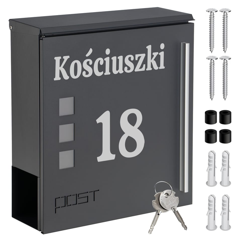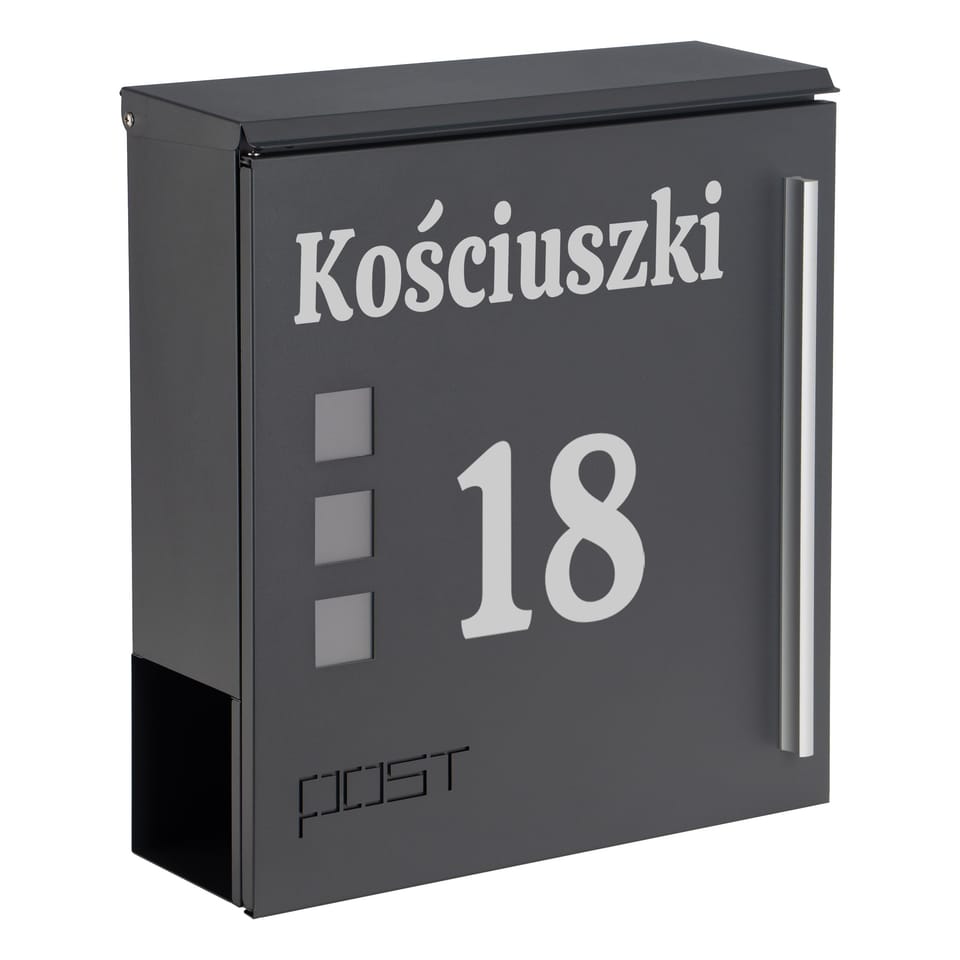 Skrzynka pocztowa na listy Miluz antracyt z napisamiKolor: Antracyt⭐️ W zestawie: skrzynka na listy z napisem + 2 kluczyki + zestaw montażowy⭐️ Stal nierdzewna galwanizowana⭐️ Wymiary: 34 x 31 x 11 cm⭐️ Posiada gazetnik oraz okienka podglądu zawartości⭐️ Wrzut zasłonięty uchylną klapą⭐️ Zamykana na klucz⭐️ Zestaw montażowy: dystanse, kołki, wkręty Skrzynka na listy Miluz z napisem łączy styl, trwałość i funkcjonalność. Wykonana z odpornej na warunki atmosferyczne stali galwanizowanej, prezentuje się elegancko i jest praktyczna. Wyposażona w miejsce na gazety i ulotki oraz uchylną klapę chroniącą korespondencję, zapewnia bezpieczeństwo dzięki zamknięciu na klucz. Okienka umożliwiają szybkie sprawdzenie zawartości, a dołączony zestaw montażowy ułatwia instalację. Produkt spersonalizowanyMożliwość wykonania dowolnego napisu: nr domu, nazwa firmy, nazwisko, ulica itp. Napis wykonany jest metodą ploterową folią Oracal, odporną na warunki atmosferyczne. Folia jest w kolorze srebrnym. Cechy produktuMateriał: stal nierdzewna galwanizowana malowana proszkowoOzdobna wstawka: stal nierdzewnaDodatkowa funkcja: gazetnik na gazety i ulotki, okienka do podgląduZabezpieczenie wrzutu: uchylna klapaZamknięcie: na klucz (2 kluczyki w zestawie)Zestaw montażowy: dystanse, kołki, wkrętyWymiary: wys. 34 x szer. 31 x gł. 11 cmRozstaw otworów montażowych: 23 x 17 cmWymiar otworu na listy: 30 x 3 cmMontaż wewnątrz i na zewnątrz W zestawieSkrzynka z napisem2 kluczykiZestaw montażowy Podaj nam wytyczne do personalizacji Twojej skrzynkiW momencie dokonywania zakupu w wiadomości do sprzedającego proszę podaj: wybrany wzór czcionki, napis do wykonania. (przykład: wzór nr 2, Kościuszki 18). Napis zostanie wykonany dokładnie wg wytycznych z wiadomości do sprzedającego. Napisy mogą mieć same wielkie litery np. "KOŚCIUSZKI" lub małe litery np. "cicha". Wyjątkiem jest wzór nr 4 którego czcionka ma tylko wielkie litery. Jeśli napis ma być wykonany ze skrótem ulicy "ul." to również prosimy podaj taką informację. Polskie znaki są dozwolone (np: ę,ą,ć,ś itp.).Wzór czcionki do wyboru:wzór nr 1wzór nr 2wzór nr 3wzór nr 4wzór nr 5 Marka:GockowiakKod produktu:331392MGKolor:antracytWysokość całkowita:34 cmSzerokość całkowita:31 cmGłębokość cakowita:11 cmMateriał:stal szlachetna galwanizowana Informacje dodatkoweProsimy o przemyślany zakup. Nie ma możliwości zwrotu produktów spersonalizowanych.Przedstawione kolory należy traktować poglądowo - mogą odbiegać od rzeczywistych ze względu na różne ustawienia monitorów oraz proces obróbki zdjęć. Rzeczywiste wymiary mogą się różnić od podanych wyżej. Tolerancja błędów może wynosić +/- 5%.