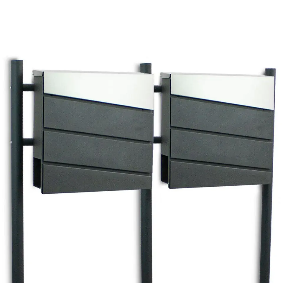 Podwójna i nowoczesna skrzynka na listy na stojaku jest odporna na opady atmosferyczne. Skrzynka pocztowa jest wykonana ze stali nierdzewnej, a grubość ścianek to około 0,8mm. Skrzynki posiadają otwory z tyłu, które pozwolą na łatwy montaż do słupków. Designerski wygląd zagwarantuje dbałość oraz styl na Twojej posesji.