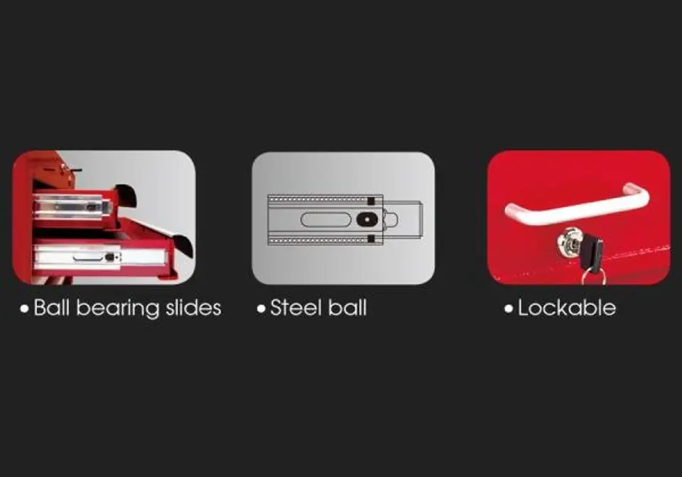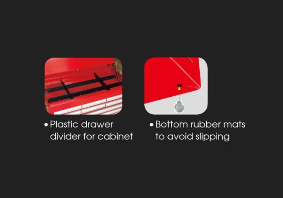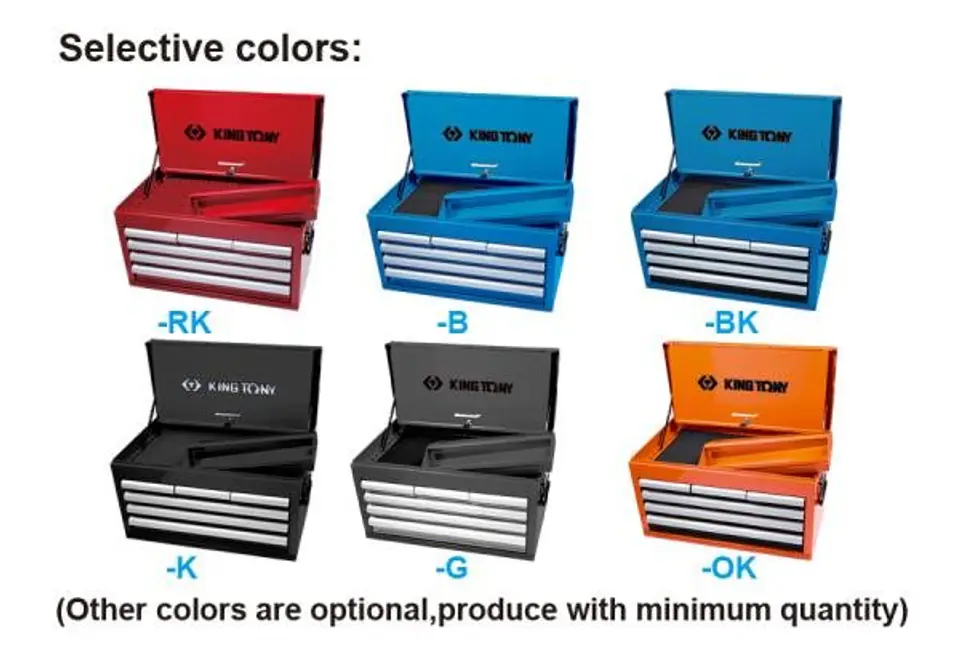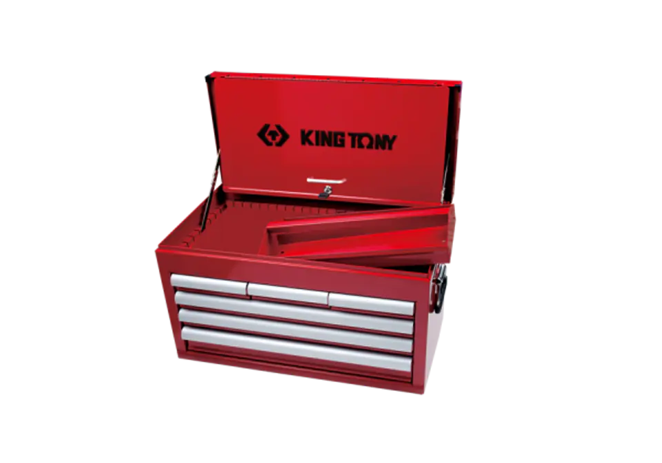 Skrzynka na narzędzia King Tony. Skrzynka posiada 6 szuflad oraz półkę w górnej części. Od spodu skrzynka zabezpieczona jest gumowymi podkładkami. Po bokach posiada uchwyty ułatwiające przenoszenie skrzynki. Szuflady łożyskowane, centralny zamek. Wymiary całkowite: szer. 660 x gł. 307 x wys. 374 mm. Wymiary półki: szer. 646 x gł. 290 x wys. 60 mm. Wymiary szuflady: 3 x szer. 170 x gł. 275 x wys. 50 mm. Wymiary szuflady: 2 x szer. 569 x gł. 275 x wys. 50 mm. Wymiary szuflady: 1 x szer. 569 x gł. 275 x wys. 75 mm Karta produktu - 87411-6B