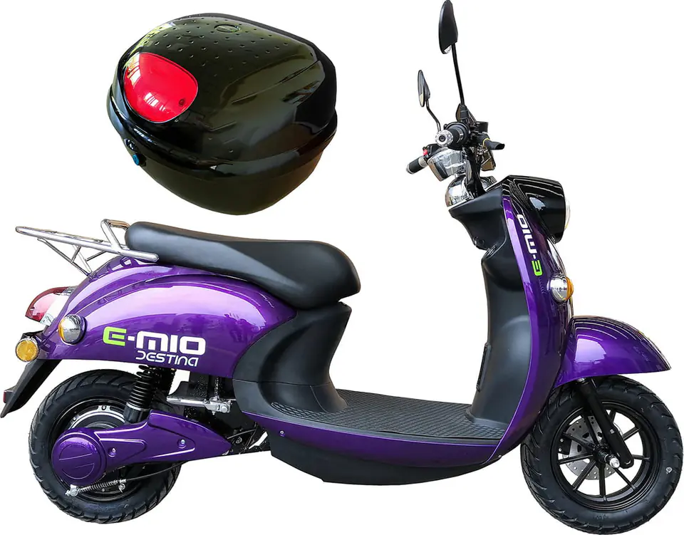 E-mio Destina to trzybiegowy skuter z klasycznymi reflektorami (biegi/tryby jazdy przełączane przełącznikiem w rączce), posiadający wymienną, przenośną baterię. Bezszczotkowy silnik o mocy 2000 W, umiejscowiony jest w tylnym kole, dzięki czemu skuter jest właściwie bezobsługowy – nie wymaga przeglądów i konserwacji poza okresową wymianą klocków i tarcz hamulcowych.