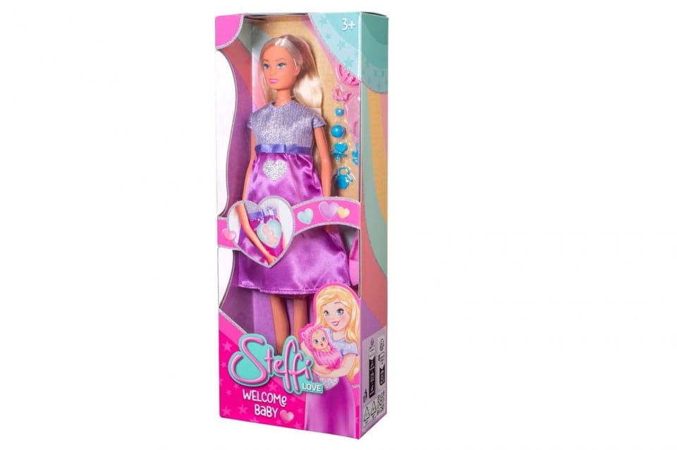 SL Steffi w ciąży \nSteffi - przyszła mama z niemowlakiem w brzuchu, ubrana w letnią sukienkę ze wstążką, z akcesoriami do pielęgnacji bobaska, wysokość 29cm, 3l+