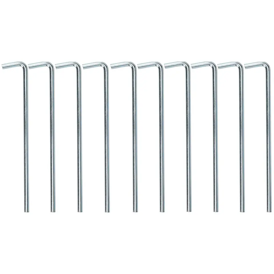 Zestaw składa się z 10 metalowych śledzi wyposażonych w specjalny zagięty uchwyt ułatwiający wbijanie w podłoże.