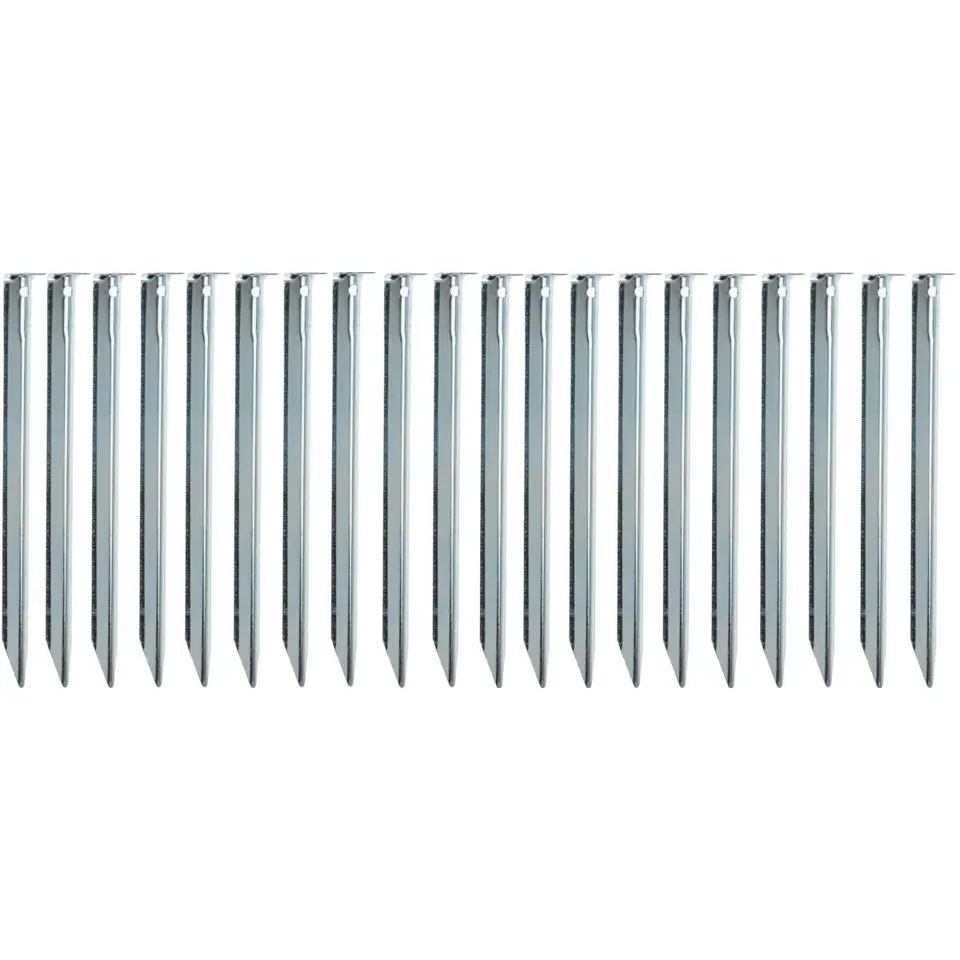 Zestaw składa się z 20 metalowych śledzi wyposażonych w specjalny uchwyt ułatwiający wbijanie w podłoże.