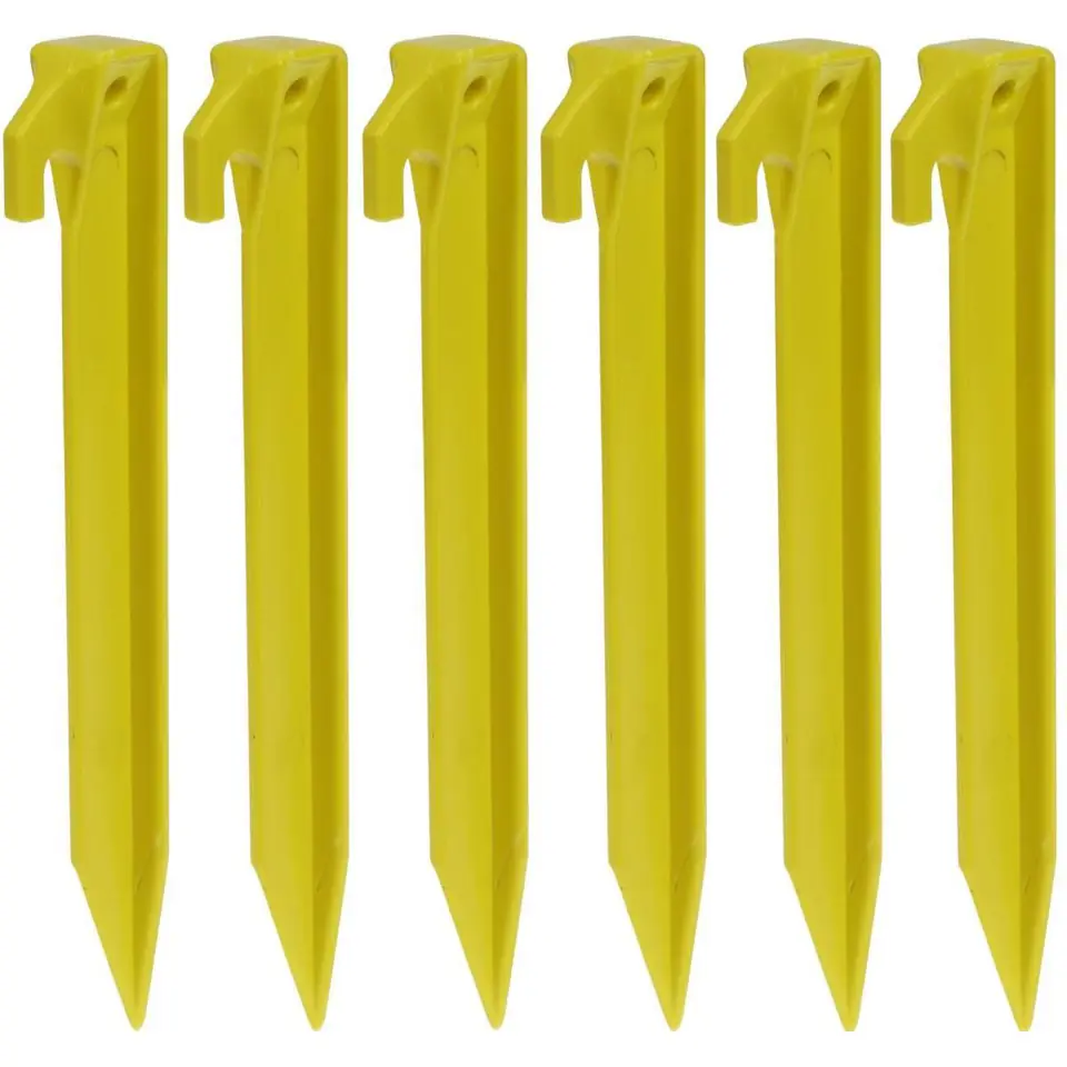 - wykonane z plastiku odporne na zmienne warunki atmosferycznewykonane z mocnego materiału ABSw jaskrawym żółtym kolorze dobrze widoczne na piaskuz końcówką w kształcie V która idealnie wbije się w podłożew zestawie 6 śledzi o długości 23 cm
