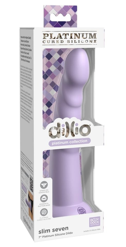 Dildo with a strong suction cup Wonderfully curved, flexible and bendy Pronounced stimulating grooves Slight glans Strap-on compatible – perfect for the Body Dock SESoft and gentle for amazing feelings! The flexible Slim Seven dildo from Dillio Platinum is in a beautiful, classic and wonderfully curved design with pronounced stimulating grooves and slight glans. The dildo can also stick securely to any smooth surface and therefore makes hands-free fun possible. The dildo is also compatible with strap-ons and harnesses. It is made out of platinum-cured silicone. This pure, food-safe, odourless and tasteless material is used for medical purposes and is perfect for people with allergies! This material helps make the dildo wonderfully stiff and hard without it losing its flexibility. The velvety soft silicone feels smooth and it can easily be inserted. Complete length 19.7 cm, insertion length 17.8 cm, O 3.6 cm. Silicone.