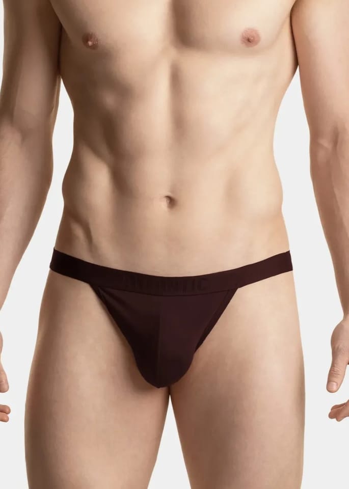 Męskie stringi charakteryzują się skąpym krojem - niska talia zaznaczona jest gumą ozdobioną logo Atlantic, która stanowi jednocześnie boki bielizny, a z tyłu znajduje się tylko wąski pasek materiału. Skład: 95% bawełna, 5% elastan.