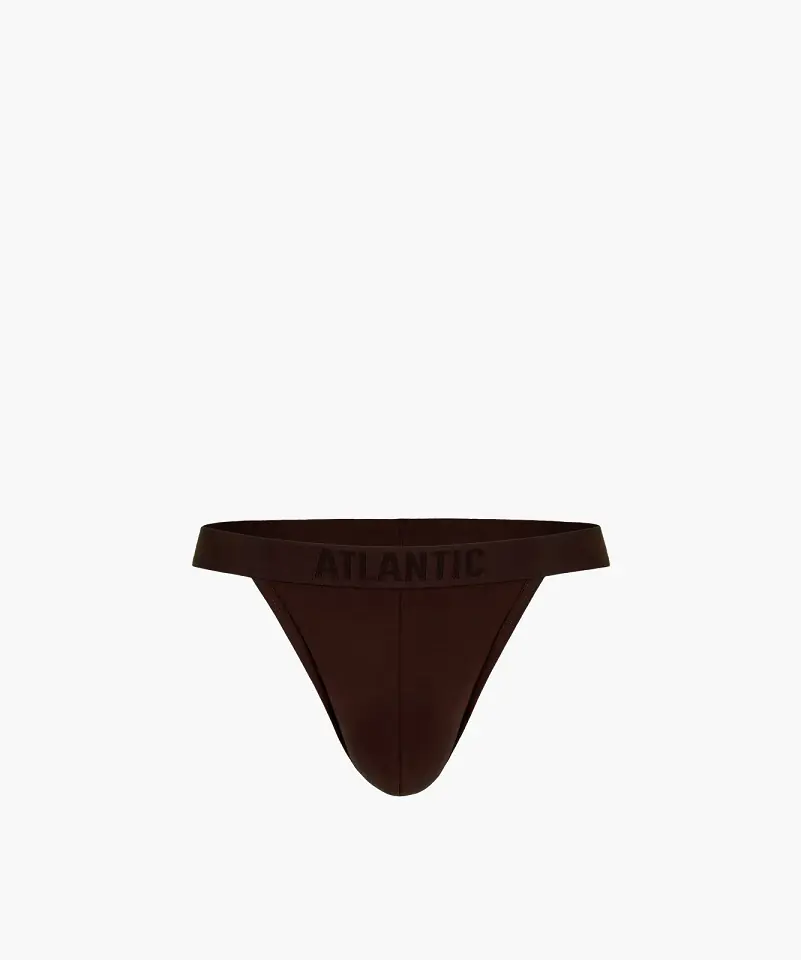 Męskie stringi charakteryzują się skąpym krojem - niska talia zaznaczona jest gumą ozdobioną logo Atlantic, która stanowi jednocześnie boki bielizny, a z tyłu znajduje się tylko wąski pasek materiału. Skład: 95% bawełna, 5% elastan.