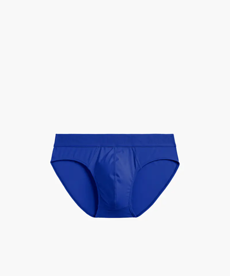 Slipy męskie o sportowym kroju, dość wysoko wycięte po bokach, niska talia zaznaczona szeroką i nieuciskającą ciała gumą. Delikatnie połyskujące szwy. Skład: 90% nylon, 10% elastan.