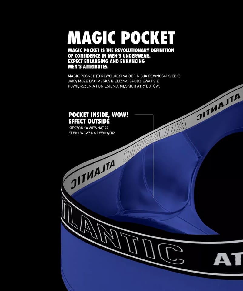 Slipy tanga z niską talią wykończoną szeroką, elastyczną gumą. Wewnątrz koszyka znajduje się specjalnie zaprojektowana kieszonka Magic Pocket, odpowiedzialna za uniesienie i optyczne uwydatnienie atrybutów. Skład: 95% bawełna, 5% elastan.