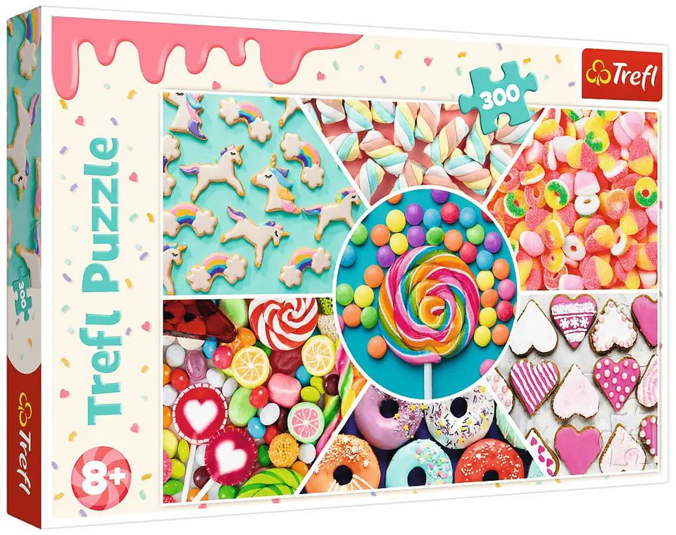 Kto uwielbia słodycze? Mamy coś dla łasuchów - Słodkości to puzzle składające się z 300 elementów przedstawiające pyszności. Produkt został wykonany z wysokiej jakości materiałów, z zastosowaniem specjalnego kalandrowanego papieru odbijającego światło, co ułatwia układanie. Produkt został wyprodukowany w Polsce, a do produkcji zostały użyte materiały ekologiczne.