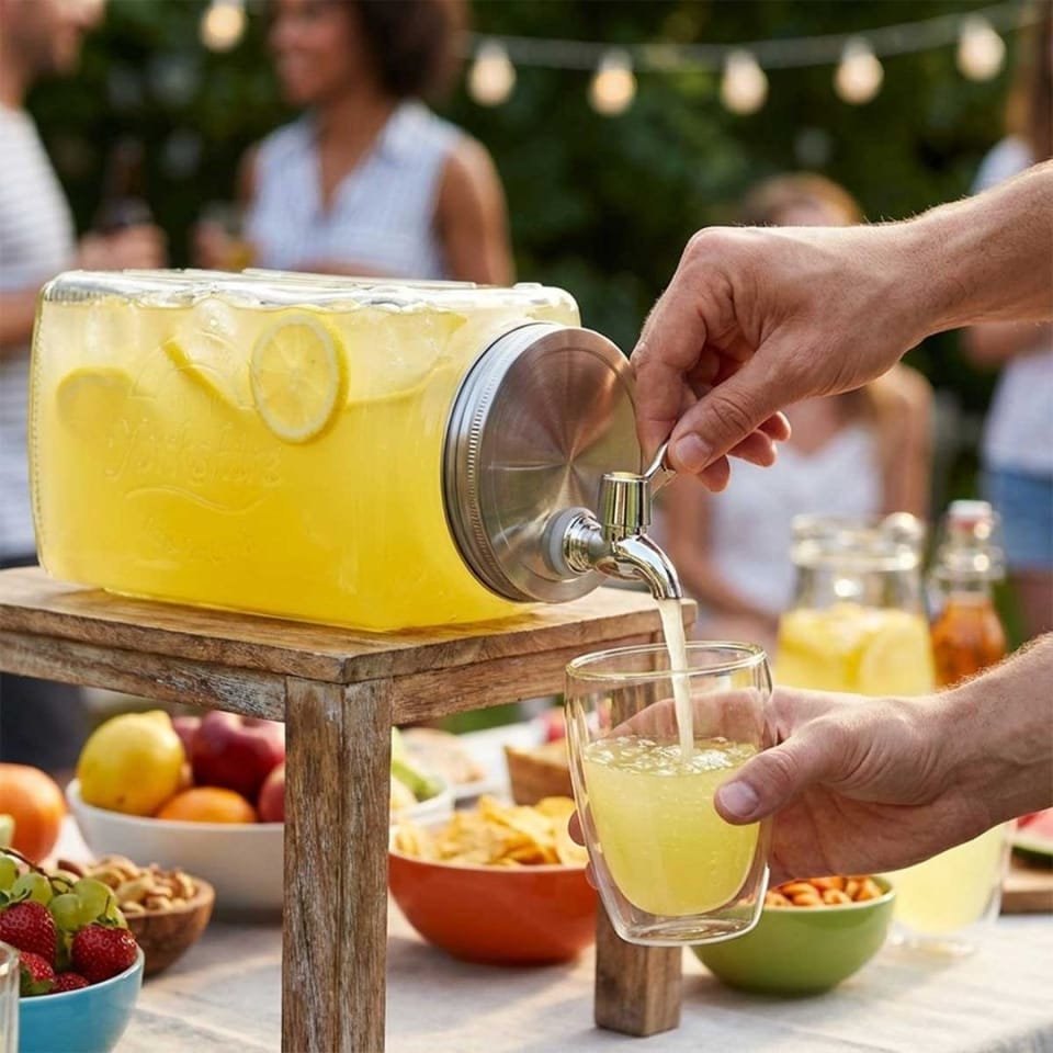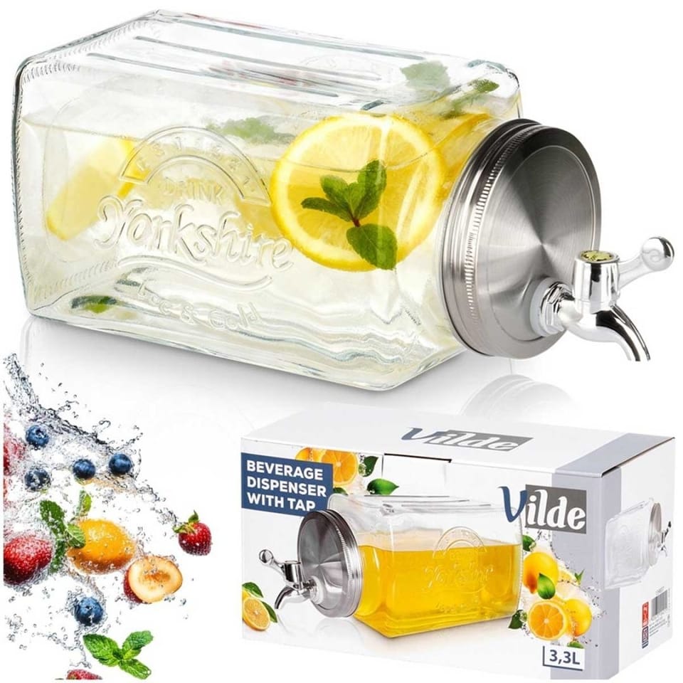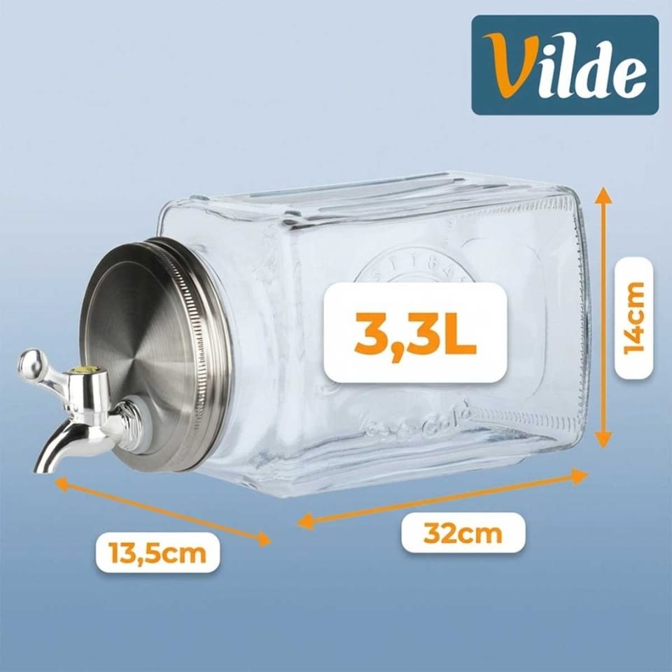 Szklany dystrybutor z kranikiem idealny do serwowania wody, lemoniady, soku, herbaty mrożonej, wody smakowej, ale również ponczu. Dostosowany do przechowywania w lodówce. Dzięki kranikowi w łatwy sposób zaserwujemy ulubione napoje w sposób efektowny. Słój wykorzystamy zarówno w ogrodzie, jak i podczas spotkań rodzinnych. Oryginalny produkt marki Vilde. Wyprodukowano zgodnie z europejskimi standardami.